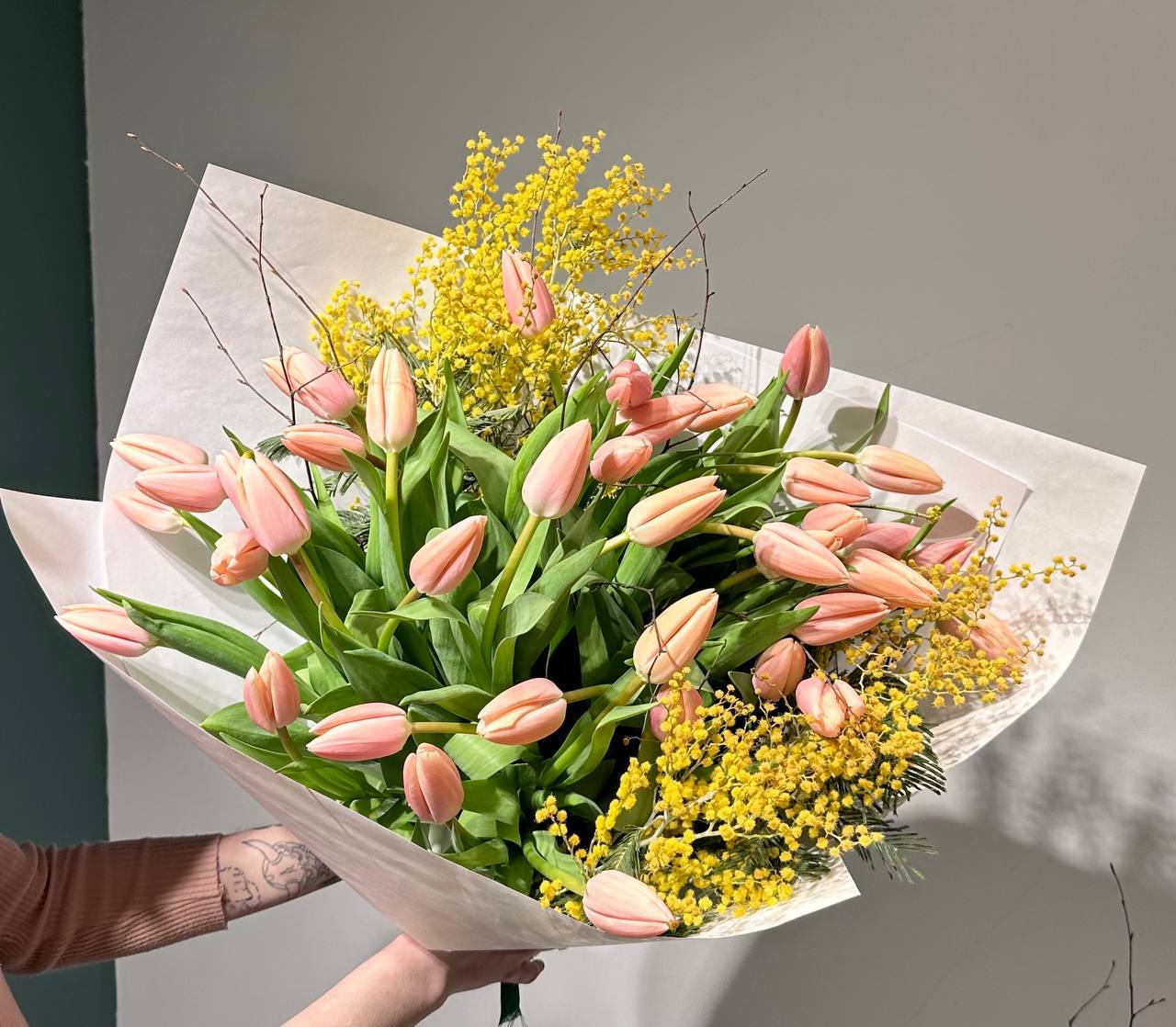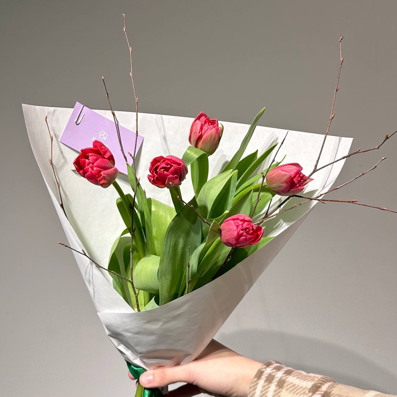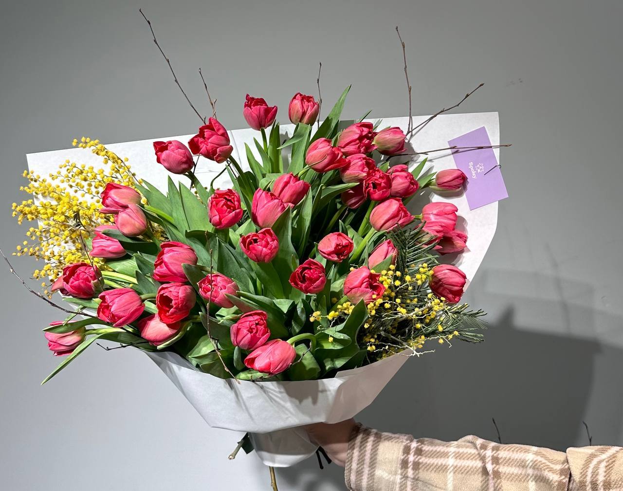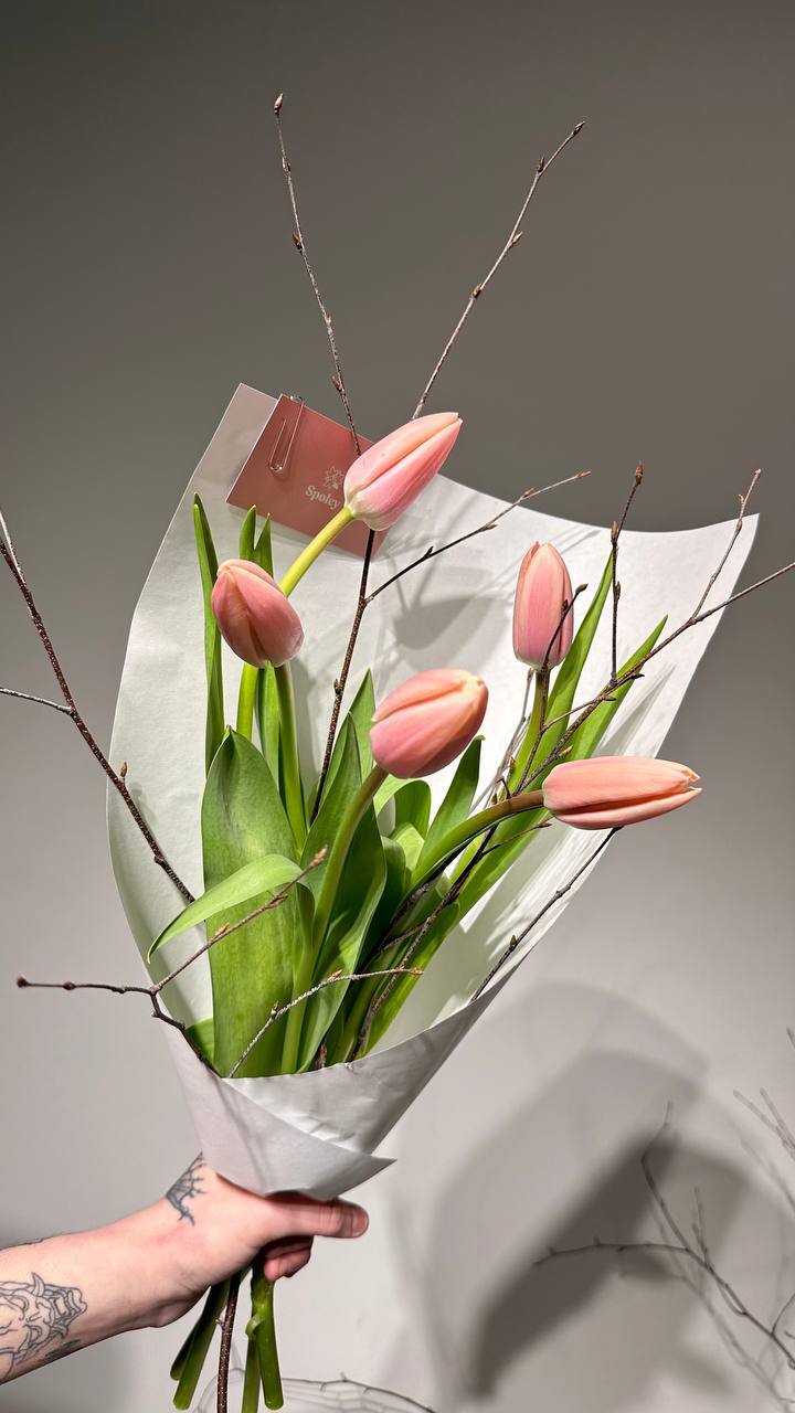 Цвет тюльпанов можно уточнить у наших менеджеров : +7 950 075 6380